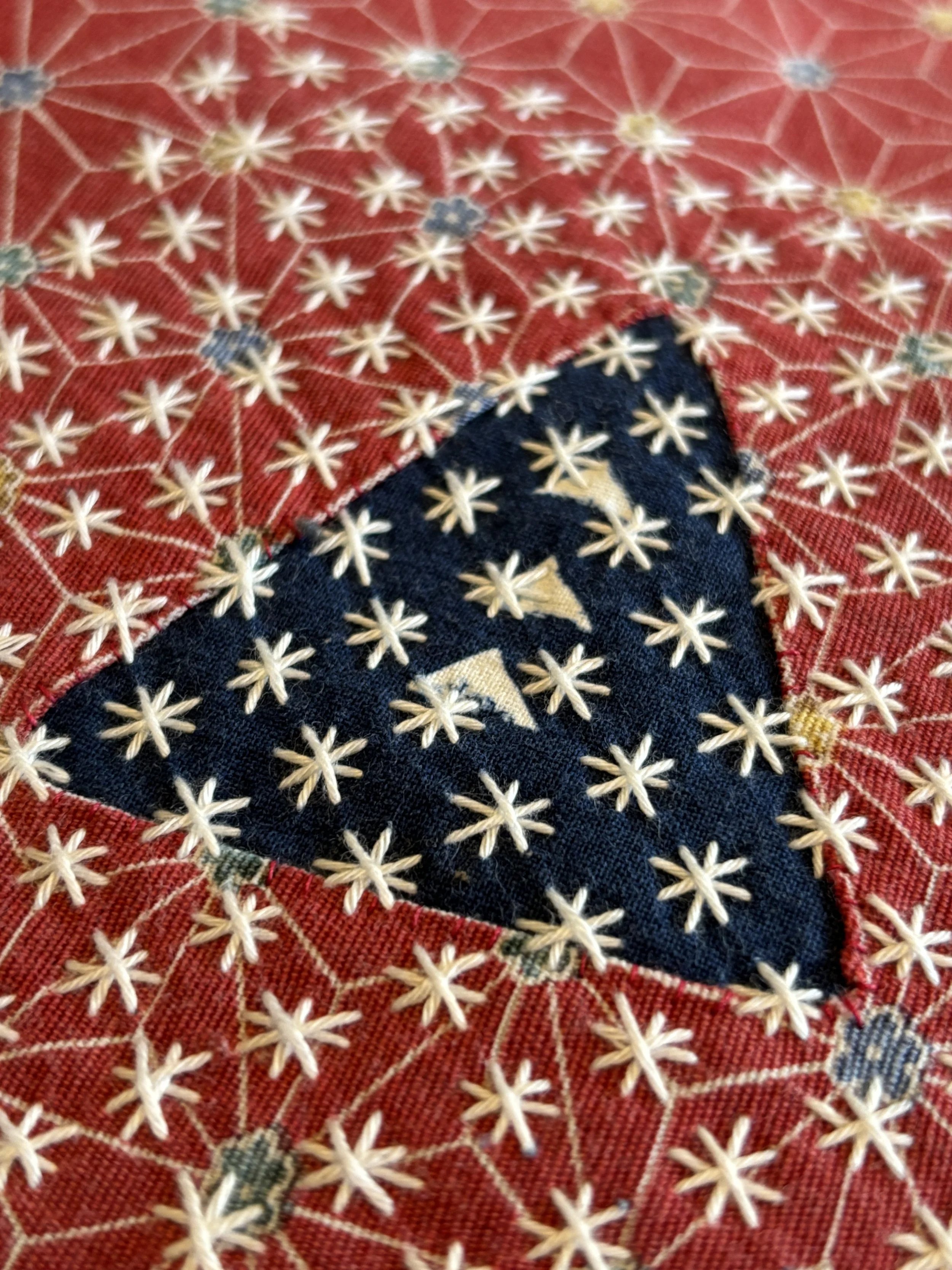 I think about the futon cover I repaired for a customer. He had a Japanese tatami futon, and the mattress cover had a beautiful geometric design, but there were a few tiny holes emerging, and one fairly large hole. He decided he would like to save the futon, rather than throw it away, and that he’d like a repair in keeping with the style. I did a sashiko repair on each hole in the fabric, following the original geometry where I could.