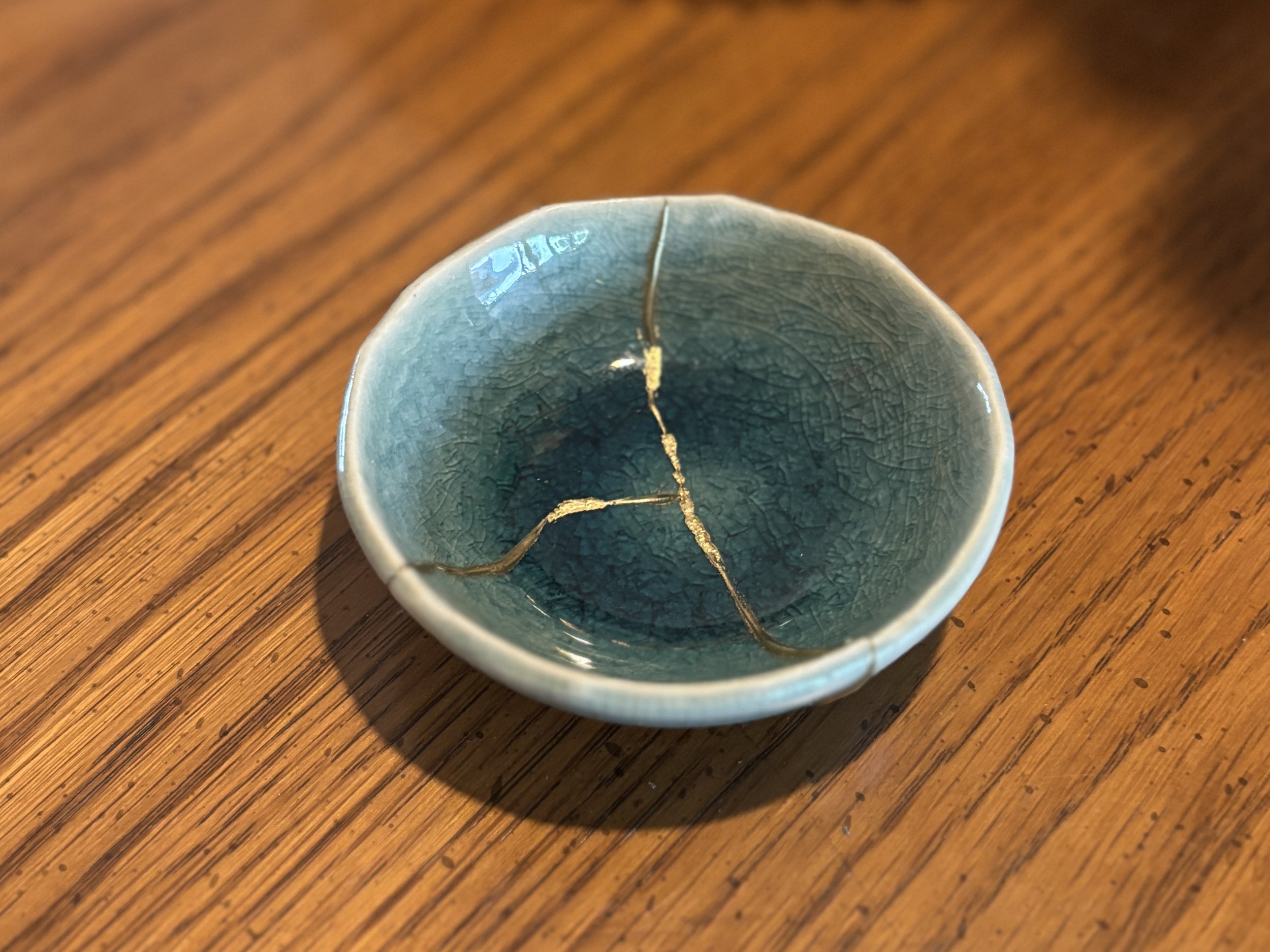 The repair was what we would call “visible mending” – an obvious patch, made to highlight the flaw as a feature, like kintsugi repairs using gold on broken ceramic. The gold highlights the break in a way that honors the journey of the bowl.